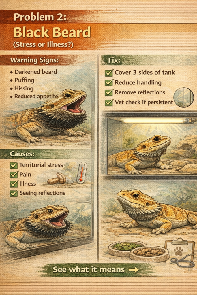 A black beard in bearded dragons signals stress, territorial behavior, or pain.